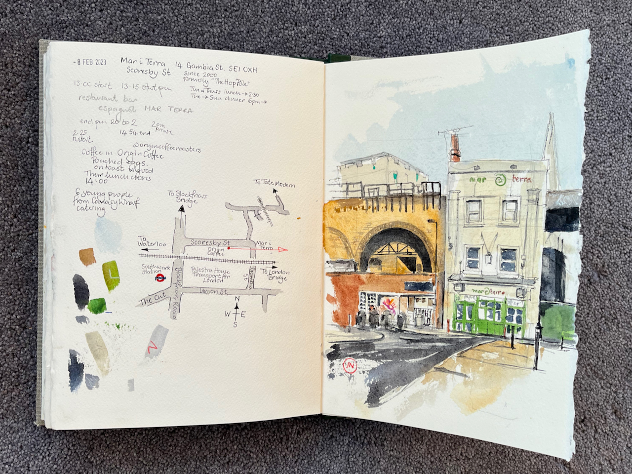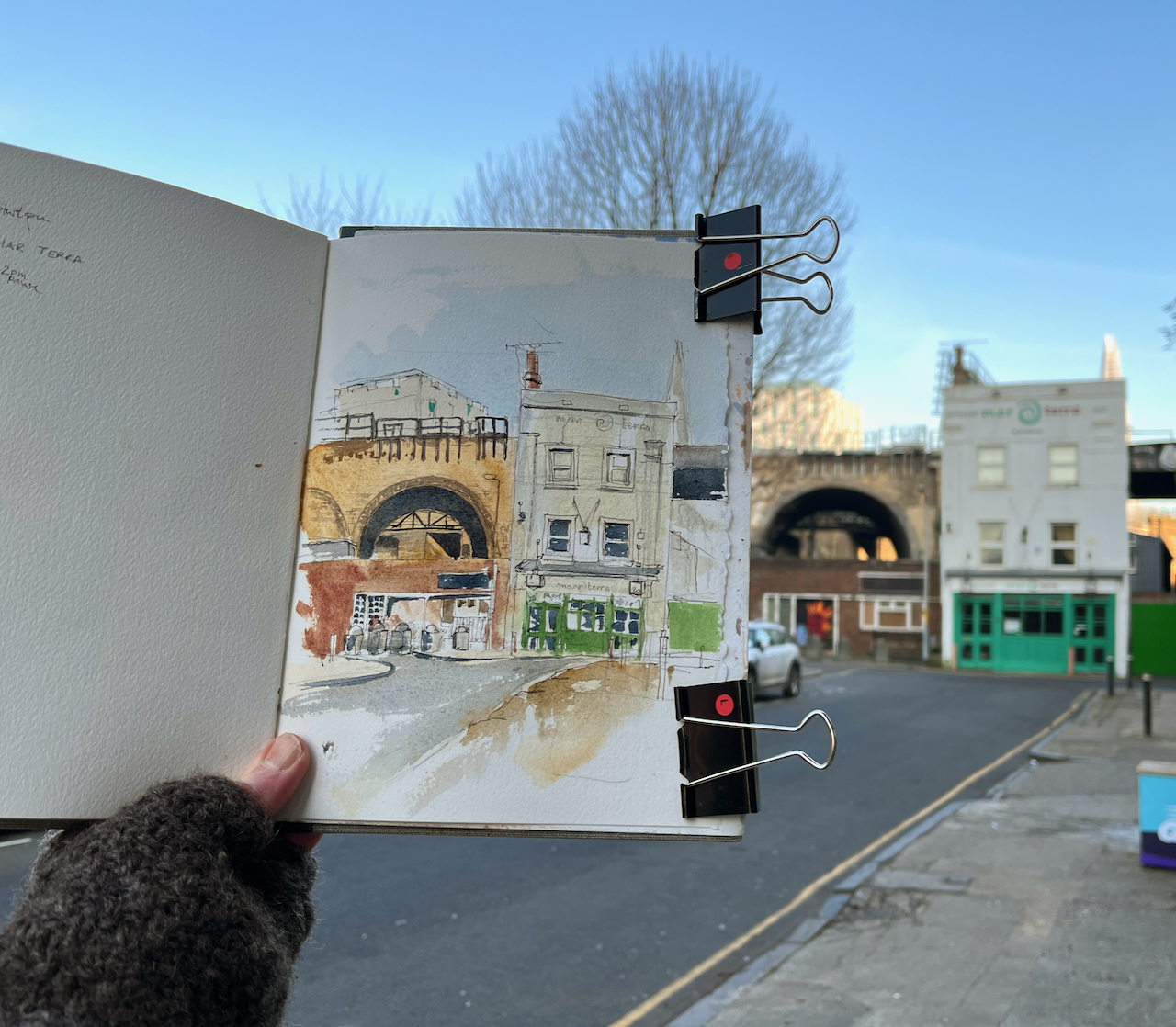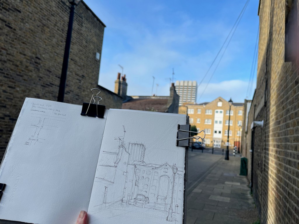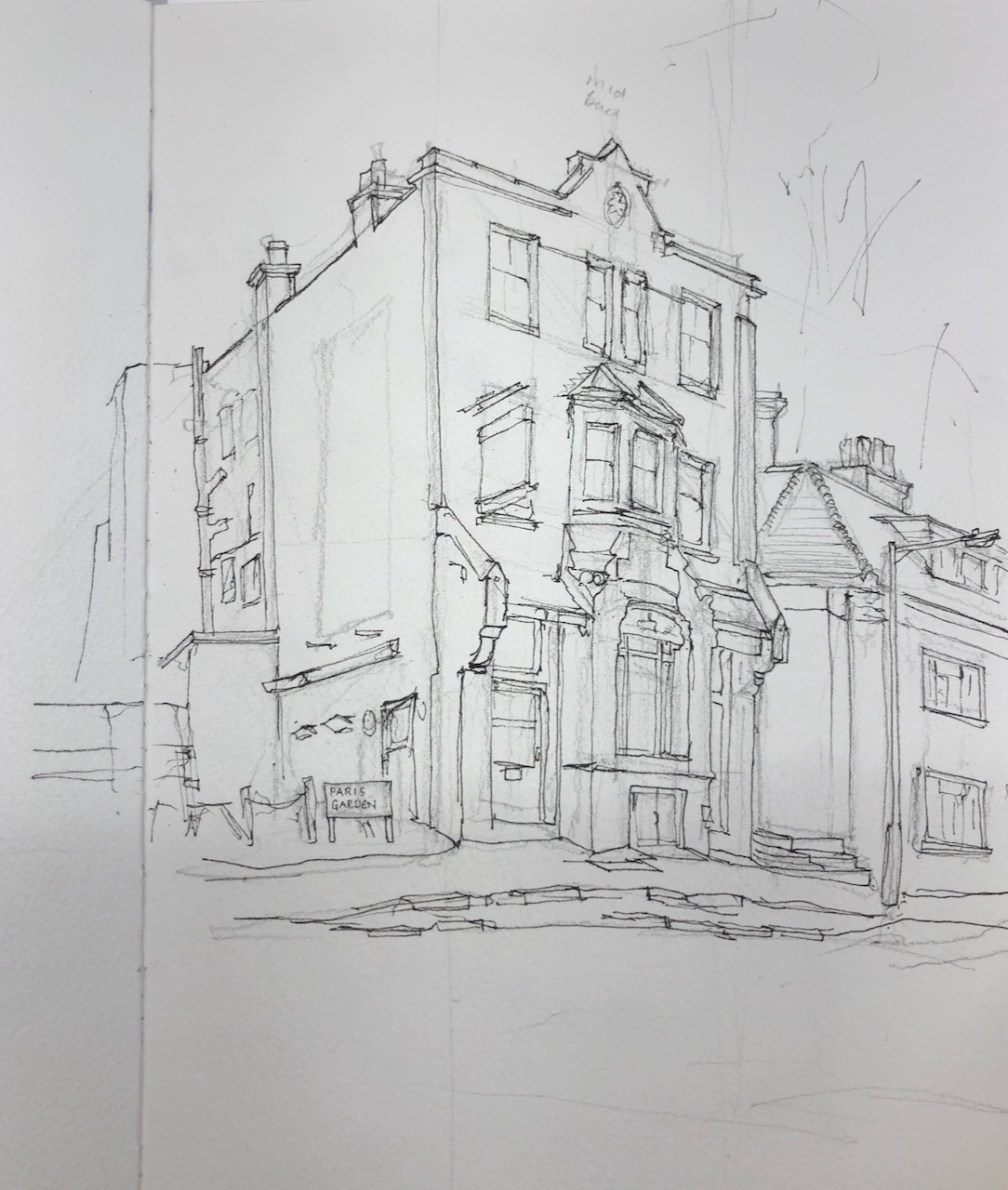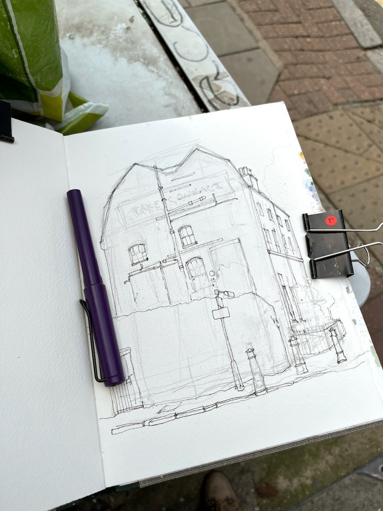 Bermondsey is an area of London just to the south of London Bridge. I had tea at the bookshop and café called “Morocco Bound”. From a table outside Morocco Bound, I sketched the building opposite.