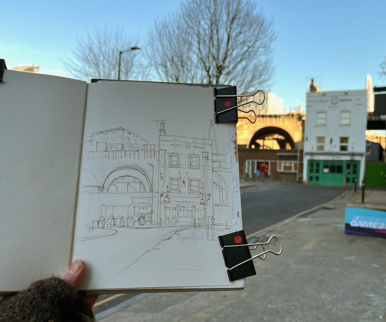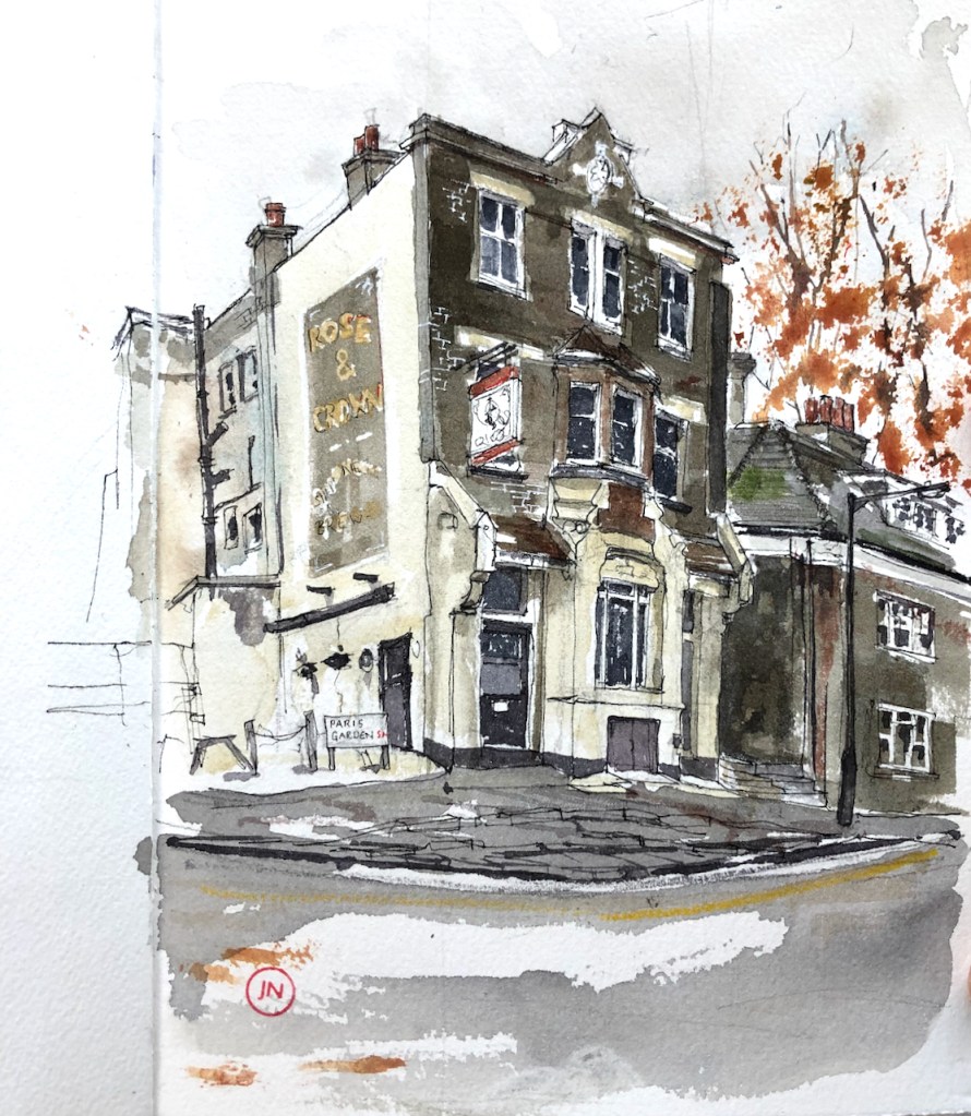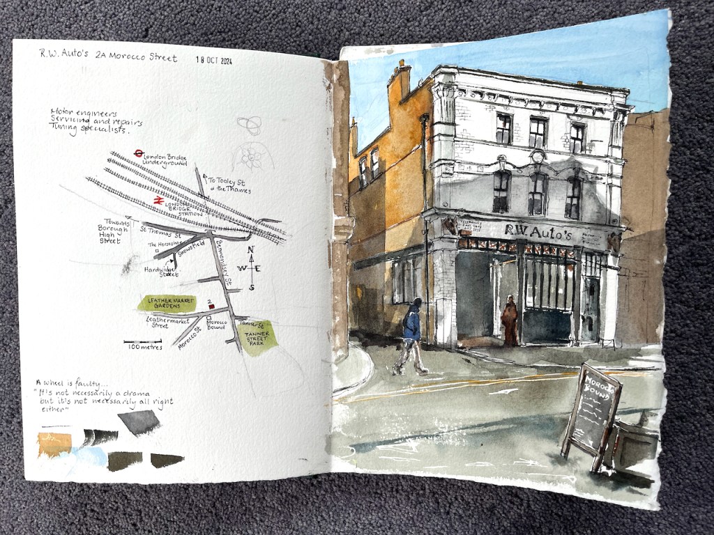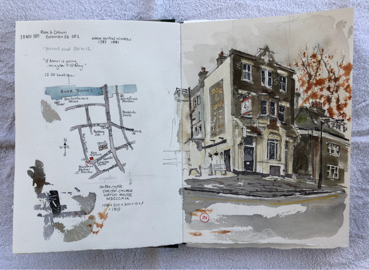 Bermondsey is an area of London just to the south of London Bridge. I had tea at the bookshop and café called “Morocco Bound”. From a table outside Morocco Bound, I sketched the building opposite.
