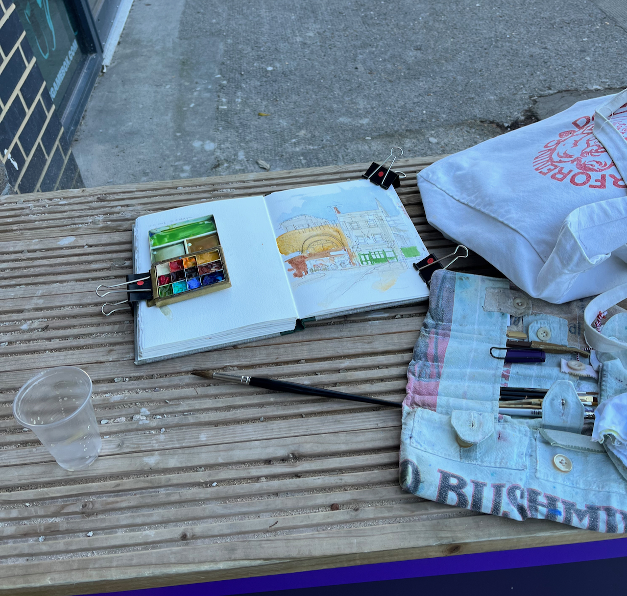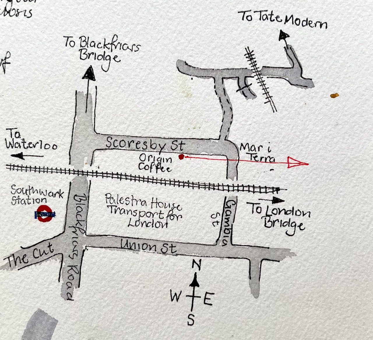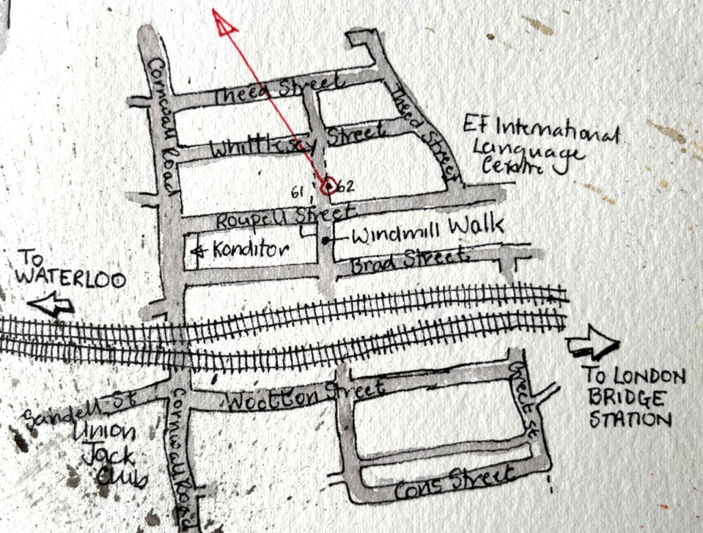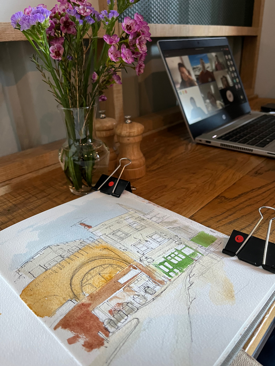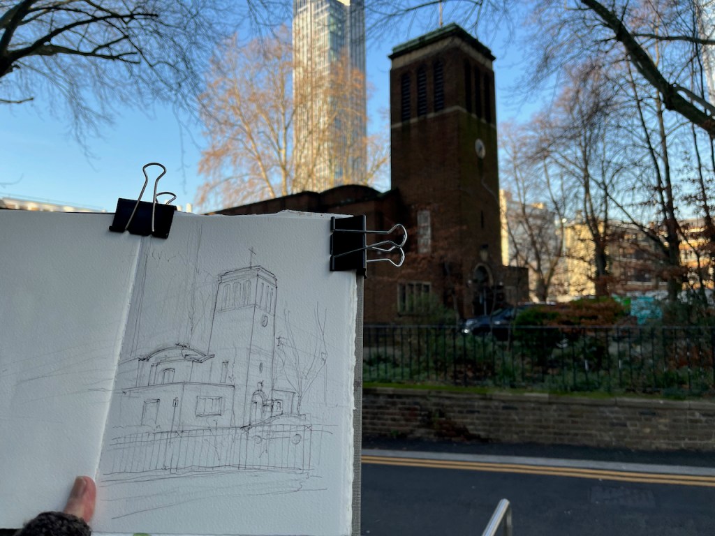 Bermondsey is an area of London just to the south of London Bridge. I had tea at the bookshop and café called “Morocco Bound”. From a table outside Morocco Bound, I sketched the building opposite.