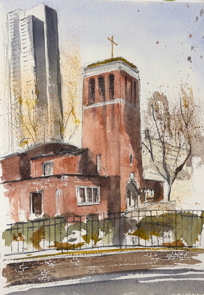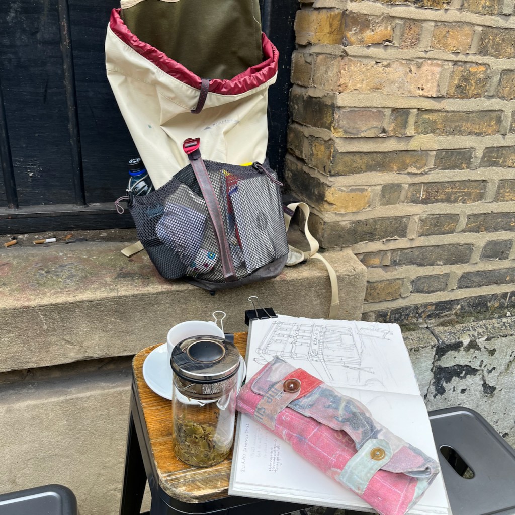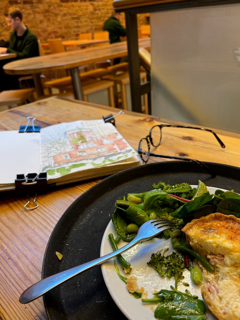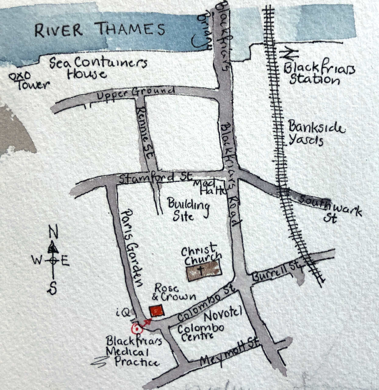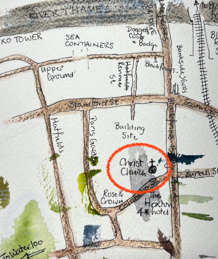 Bermondsey is an area of London just to the south of London Bridge. I had tea at the bookshop and café called “Morocco Bound”. From a table outside Morocco Bound, I sketched the building opposite.