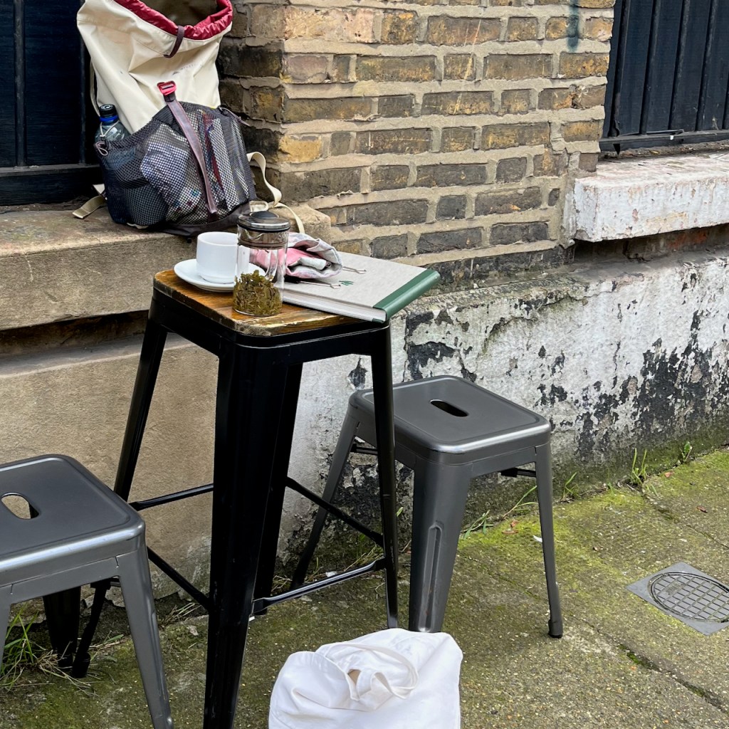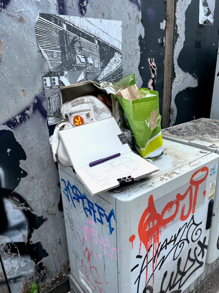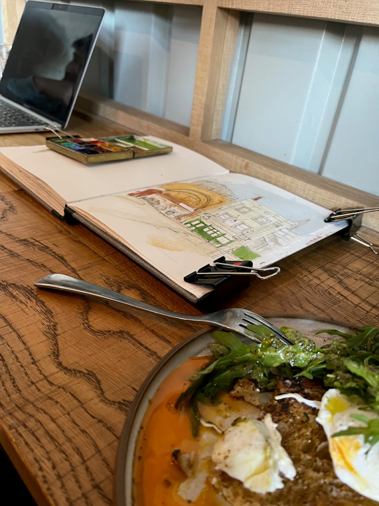 I was sketching on Morocco Street. Morocco is a type of soft leather. It is used for gloves and wallets, for example. It is also used for book bindings, hence the name of the café: ‘Morocco Bound”. According to the “Medieval and Early Modern Orients (MEMOs)” scholarly site1, Morocco leather was originally “a kind of extremely fine, soft, hard-wearing, and richly dyed sumac-tanned goatskin, originating in the Sokoto region of northern Nigeria, transported across the Sahara and exported to Europe by Maghrebi, particularly Moroccan, merchants.”. This was in the 16th and 17th centuries.