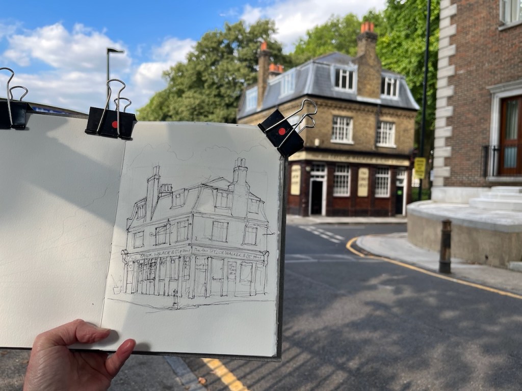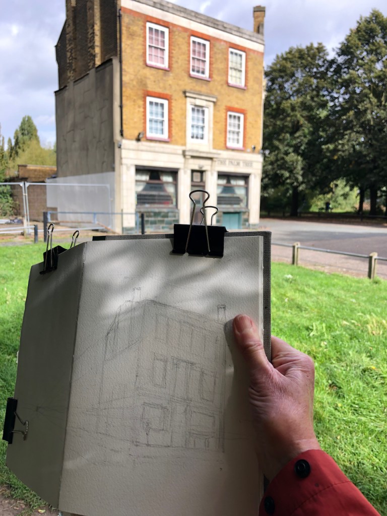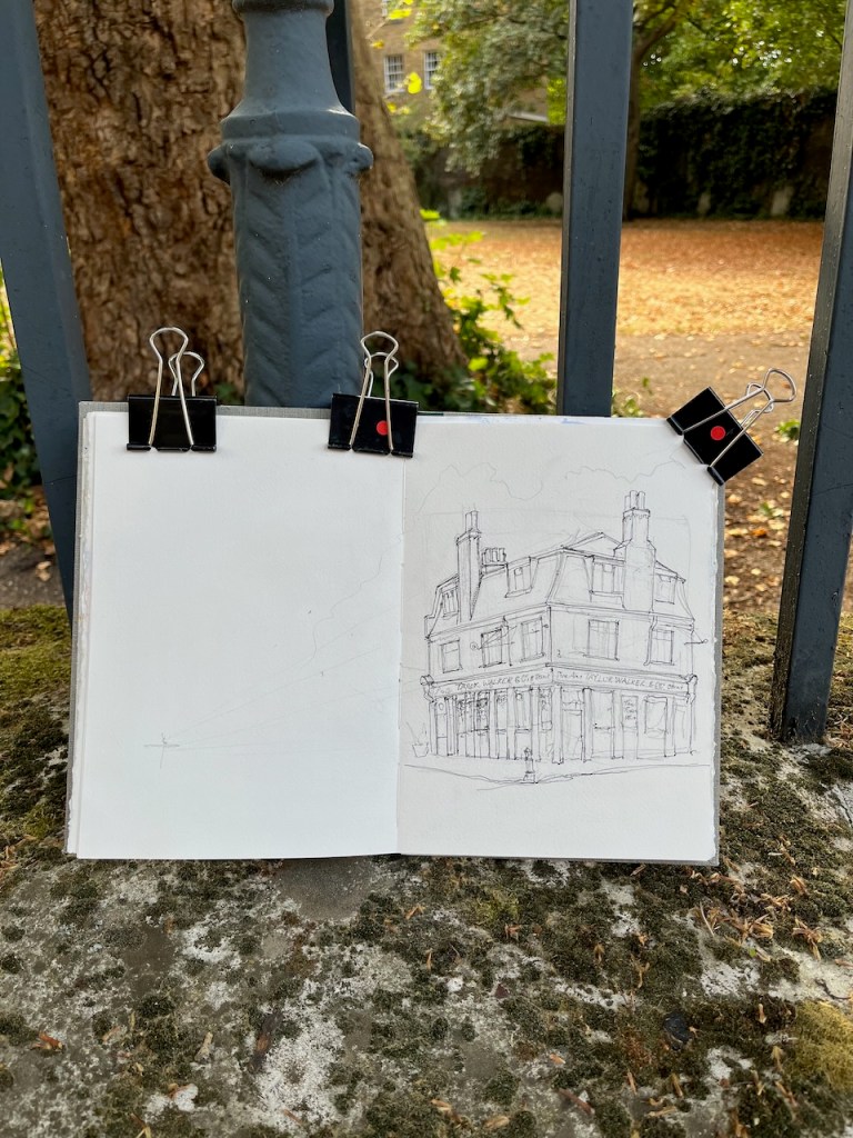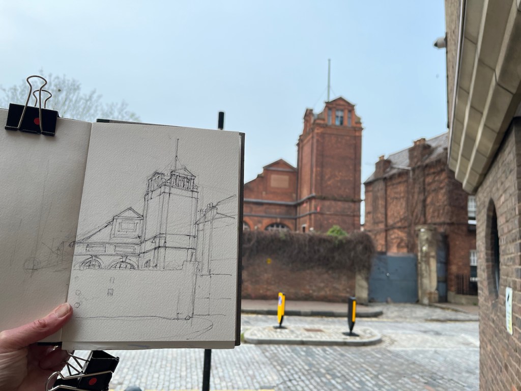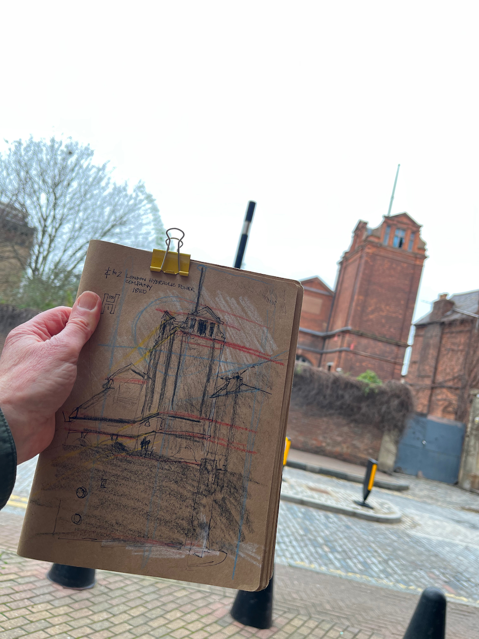 The fences in my drawing are the perimeter of a Thames Tideway tunnel construction site. The Thames Tideway Tunnel carries sewage from central London to Becton Sewage Treatment Works. It runs under the Thames. At various points there is a junction between this main sewer and a local sewerage system. The site at King Edward VII is one such junction.