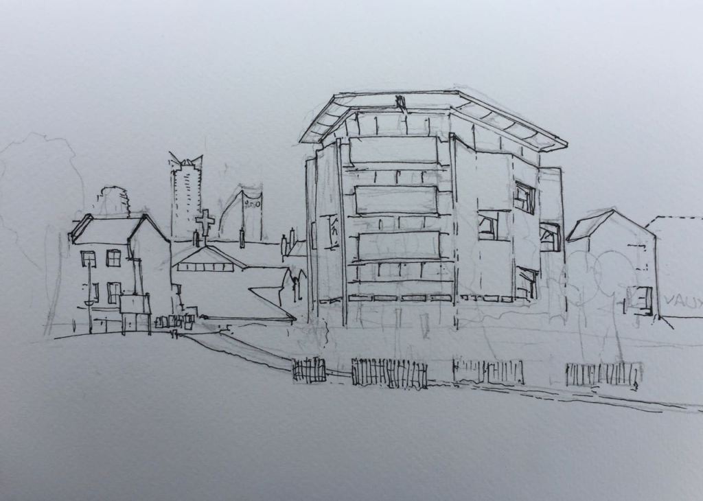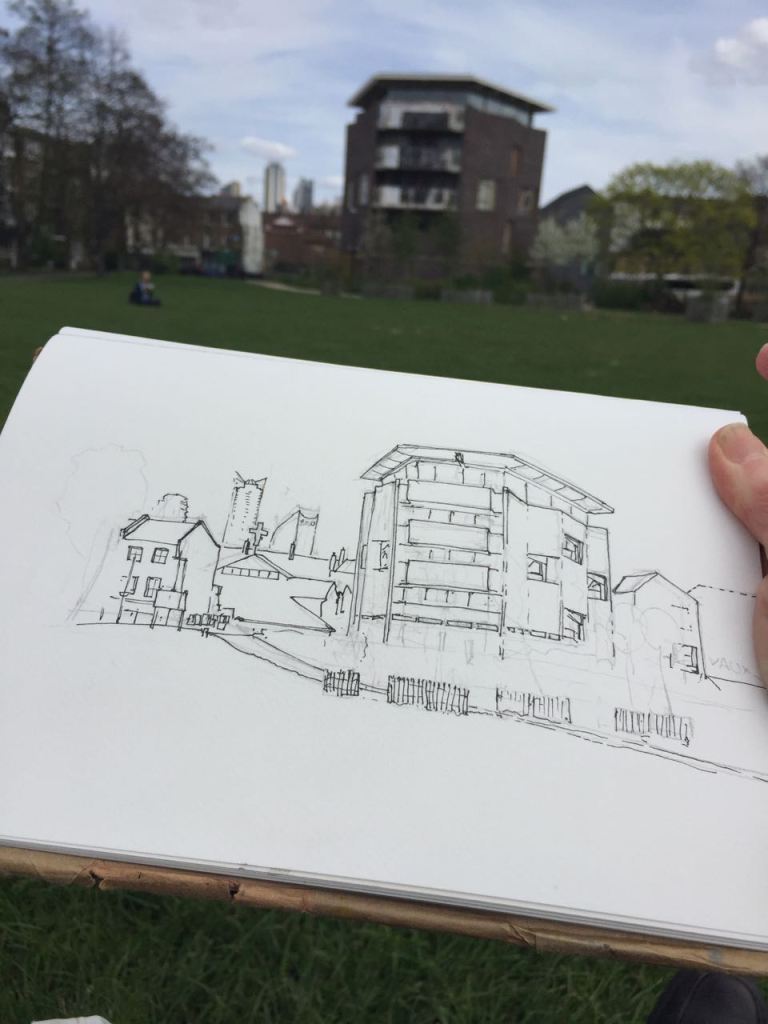 Even from the outside, the house is feels beautiful. The windows are all different, and there is intriguing detail, such as the terracotta frieze above the window shown in my picture. This is a house built to a loose design rather than a rigid plan. Much was created by the people there, as they went along, using materials to hand. Sketching it, I was reminded of the work of the 1970s radical architect Christopher Alexander, “A Pattern Language”.